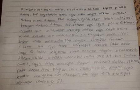 SABRINA NUR BINTI MOHD TAJUDDIN SK PARIT ZIN, MUAR, JOHOR Saya bersyukur kepada Allah SWT kerana, akhirnya saya dapat menikmati dan mengecapi kemanisan kejayaan 5A dalam peperiksaan UPSR 2014 yang lau. Alhamdulillah. Saya sangat-sangat bersyukur dengan kejayaan ini kerana belum pernah meraih keputusan 5A dalam mana-mana ujian atau peperiksaan sepanjang tahun 2013 hingga 2014 yang lalu. Emak dan ayah mengatakan ianya adalah keajaiban yang Allah kurniakan kepada mereka yang tidak berputus asa. Pencapaian terbaik saya ialah 3A 2B. Cikgu membisikkan kepada ayah dan ibu bahawa saya ini adalah pelajar ‘border line’. Saya dan Minuman berkhasiat Smart Coco A+ bagai tidak boleh berpisah sejak saya berada di dalam darjah 3 lagi. Emak telah mula menggunakan produk ini untuk abang-abang dan kakak saya. Saya adalah anak bongsu. Kami empat beradik telah lama meyakini khasiat Smart Coco A+ ini. Kami berempat bukanlah pelajar ‘genius’. Kami adalah pelajar yang sederhana yang memerlukan usaha yang banyak disamping pemakanan yang berkhasiat.Sepanjang hari saya kurang merasai keletihan dengan mengamalkan Smart Coco A+ ini. Balik sahaja dari sekolah kebangsaan Parit Zin pada jam 1.30 petang, saya akan berbasikal pula ke sekolah agama Parit Zin seawal jam 2.30 petang sehingga jam 6.30 petang. Inilah rutin persekolahan saya. Emak dan ayah sentiasa mengingatkan agar banyak bersabar dan minum minuman bertenaga untuk tubuh badan dan minda. Tidak hairanlah jika sekotak besar Smart Coco A+ habis dalam tempoh seminggu kerana emak dan ayah juga menikmatinya sebelum pergi kerja setiap hari.Keenakan dan kelazatan Smart Coco A+ membuatkan saya sentiasa tidak mudah putus asa. Saya sentiasa yakin boleh Berjaya jika berusaha. Smart Coco A+ memberi saya ilham dan semangat belajar. Saya tidak mudah gugup menghadapai kesukaran belajar kerana saya rasa lebih fokus dan tahu apa perlu saya buat. Jujurnya, saya memang menyukai rasa minuman Smart Coco A. Memang benar, ianya makanan minda. Saya merasa amat bertuah dengan anugerah kejayaan ini. Emak dan ayah juga telah membelikan saya hadiah yang saya ingini. Alhamdulillah.Kini kami sekeluarga menaruh keyakinan penuh kepada khasiat produk Fortune Resources. Smart Coco A+ menjadi minuman mesti pada setiap pagi. Pasti ianya akan menjadi bekal berharga untuk saya bila masuk sekolah berasrama nanti nanti. | UPSR 2014 |